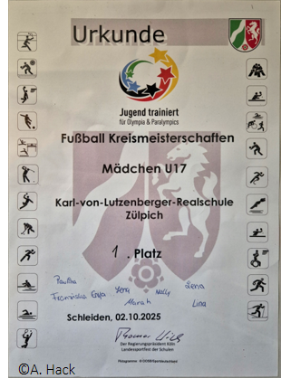 Das aktuelle Schuljahr 2025-2026 hat begonnen und somit auch das Landessportfest der Schulen NRW 2025/2026. Im allerersten Schulturnier des Kreises jubelt unsere erste Fußballmannschaft schon, denn der erste Titel des aktuellen Schuljahres geht an die Wettkampfklasse II der Mädchen. Die Schulgemeinschaft ist stolz auf diese Leistung, denn unsere Kickerinnen haben sich für die nächste Runde auf dem steinigen Weg ins Landesfinale nach Duisburg qualifiziert und treten im März 2026 gegen die Kreismeisterinnen des Rhein-Erft-Kreis und die Kreismeisterinnen aus Düren an. Nehmen sie auch diese Hürde so trennt noch die Bezirksfinalrunde unsere Mannschaft von dem Landesfinale. Hier treffen unsere Talente auf die Bezirksmeisterinnen aus den Regionen Aachen, Leverkusen und Köln. Im letzten Schuljahr belegten hier unsere jüngsten Kickerinnen der Wettkampfklasse IV (U13) einen starken zweiten Platz und scheiterten somit nur knapp am Einzug ins Landesfinale. Die KvL verlor nur gegen Leverkusen ein Spiel, alle anderen Spiele wurden souverän gewonnen.