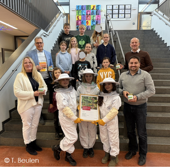 Sichtlich stolz nahmen die Schülerinnen und Schüler in ihren eigens für die Preisverleihung angezogenen Bienenschutzanzügen die Urkunde und den Geldscheck vom Bürgermeister Hürtgen und Herrn Diewald von Westenergie entgegen.